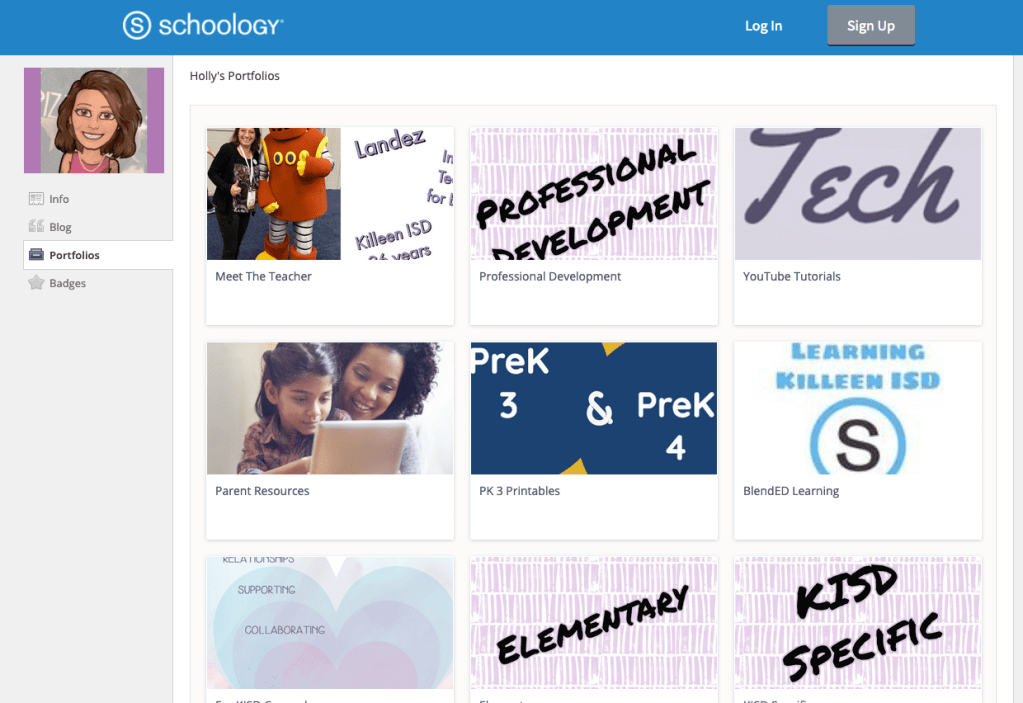 Schoology – The learning management system Schoology does have a portfolio feature. It seems to be underutilized as many people do not share work in that forum. I am able to see the benefits of having students, particularly middle school students, save their pride work there. However the Schoology portfolios does not offer the flexibility that students may find on Google sites, Wix, Weebly or WordPress. Also when the student leaves the institution, they are able to individual download zip files of each folder of work. Students are not able to keep all of the files intact in the organization that they set up. The Schoology portfolio definitely has limits. Students are not able to create or purchase a domain name. The only real creative flexibility is that users are able to add an image to each folder in the portfolio. I have an example that I use for demonstrations with teachers.