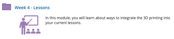 Week 4 Lessons Content – You will want to consider how you will approach 3-D printing in your classroom. Because of the cost of materials and the length of time it takes to print, you will likely not be printing an item for every single student every day, or even with every project or unit. You will also want to consider how 3D printing may fit within your pacing calendar so that it does not feel like an additional thing to do.