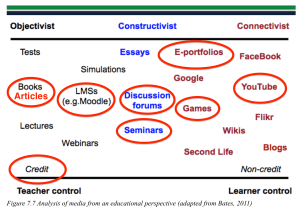 According to Figure 7.7 in Tony Bates’ Teaching in a Digital Age, the activities that I have chosen fall all over the continuum from objectivist to constructivist to connectivist. These activities also have a range of learner control versus teacher control. The main aim of my course is for staff members to practice activities that are engaging to them, fit authentically into their curriculum and that they may enthusiastically share with their learners. As this course is completely elective, I want it to be engaging, meaningful, time well spent.
