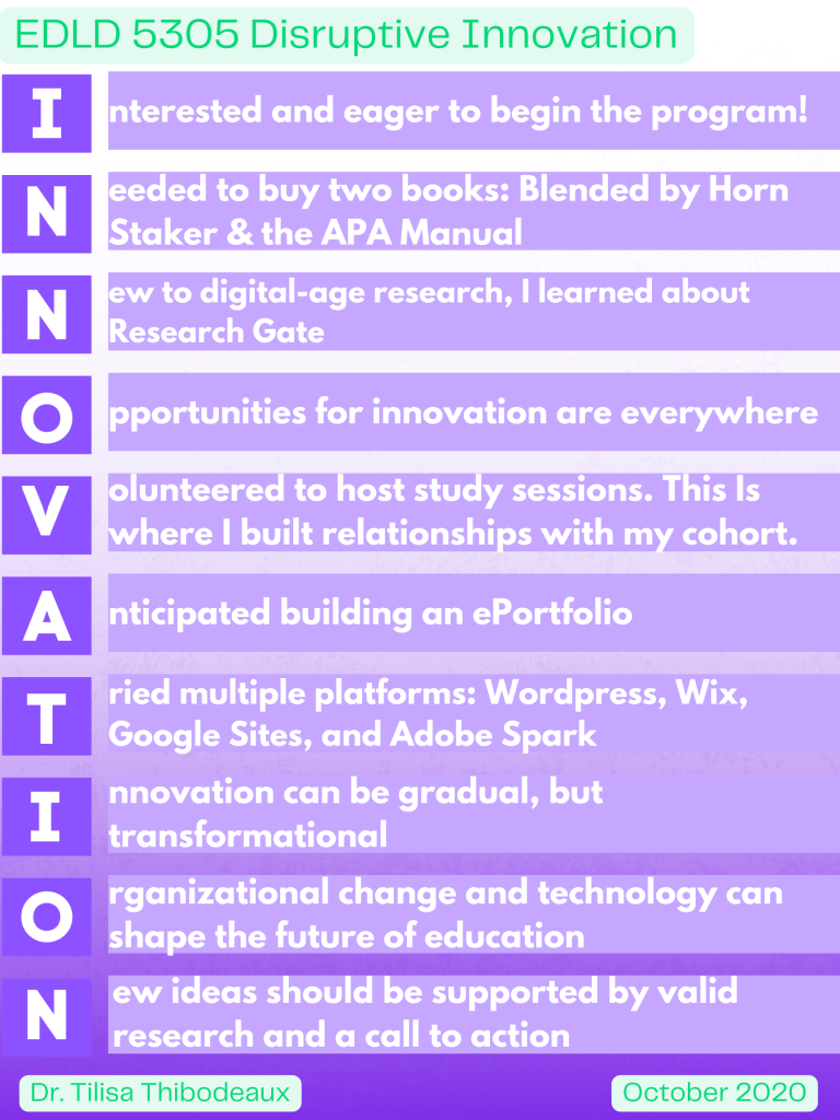 After I chose an idea for an innovation plan and submitted all assignments for EDLD 5305, Disruptive Innovation in Education, I felt very comfortable with the notion of pursuing the plan and documenting that in an ePortfolio. I was not completely sure that the innovation plan would carry me throughout the entire program. The STREAM camp would be done by the end of June 2021. So what would I innovate (and write about) after that? As the program progressed and the goals of each EDLD course revealed themselves, I was able to adapt my innovation plan and mold my coursework to fit with the overarching concepts. While every topic that I addressed was not directly related to STREAM camp, I generally focused on the realm of these topics: