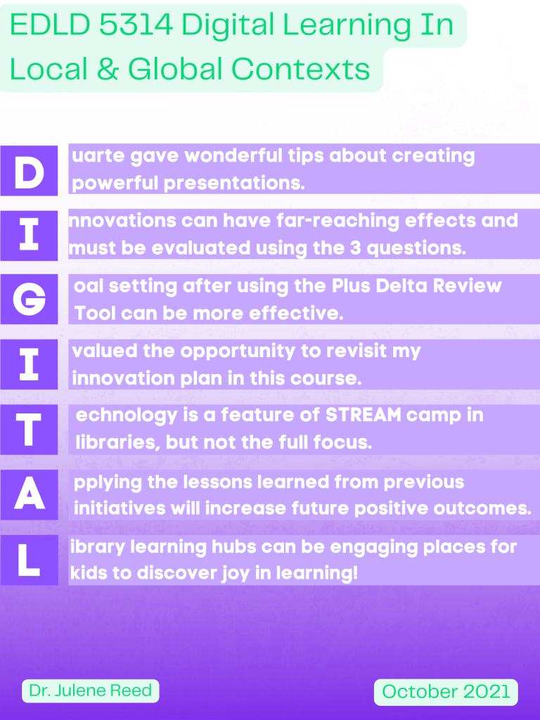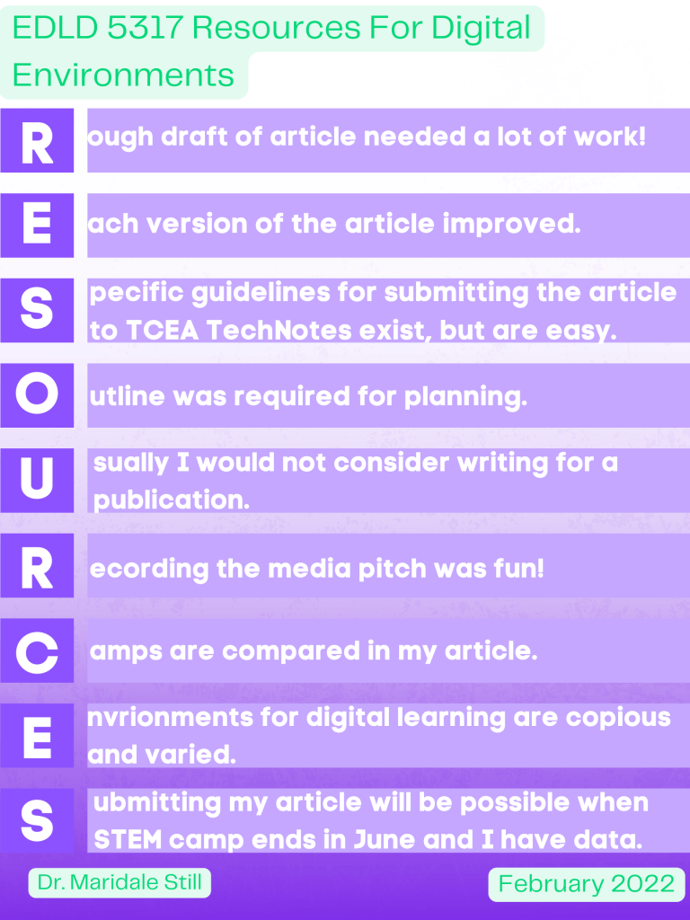 EDLD 5317 Resources For Digital Environments put me somewhat out of my comfort zone as we were tasked to write an article to submit to an actual reputable publication. We developed an outline, rough draft, media pitch, and final draft. The topic of my article was to compare the STREAM Camp of my innovation plan to the STEM camp in my new district. After I have an opportunity to gather data on the STEM camp coming up in June 2022, hopefully I will gain the courage to submit the article to the TCEA Tech Notes blog spot. Part of being a true digital learning leader is to recognize and highlight successful innovations to inspire others to innovate in their learning environments.