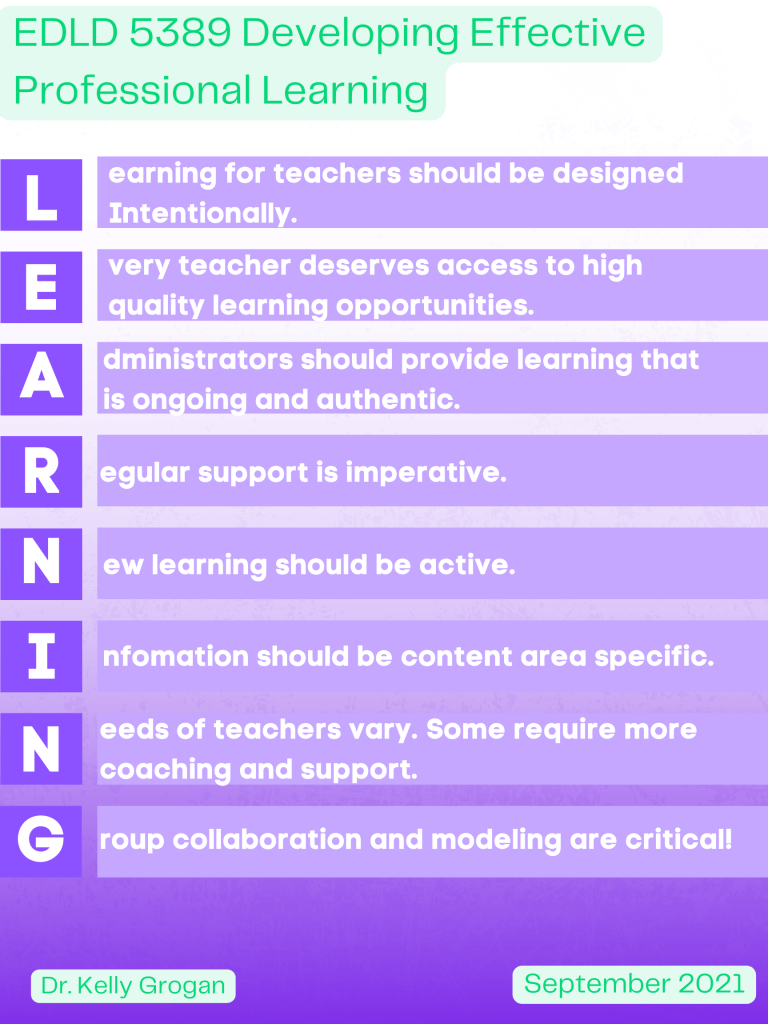 In EDLD 5389 Developing Effective Professional Learning, we studied the work of Allison Gulamhussein to learn strategies for engaging teachers in authentic and active professional learning. Once again, I used an Understanding by Design Template and began a 3 Column table to design a 3 year professional learning plan that was :