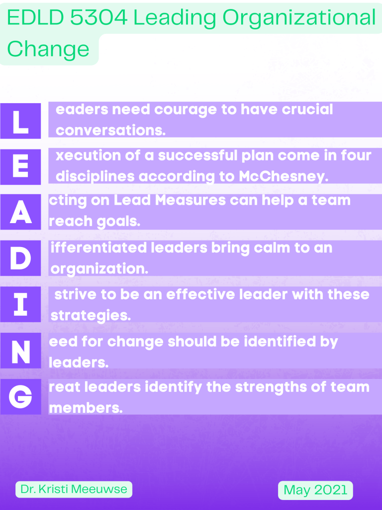 EDLD 5304, Leading Organizational Change was a powerful course for me because it empowered me with tools to influence innovation in my district. In that course, I shifted my focus from STREAM Camp to library transformation. What a joy it was to go back and revisit this work we completed slightly less than a year ago. This course was rich with learning and prompted me to observe the behavior of those around me. As I reflect on that time in my professional career, this course helped me GROW. I was working with a very out-spoken close colleague at the time. Without the benefit of reading Crucial Conversations and Influencer, I may not have grown the courage and backbone I needed to establish my ability to lead. Also, many of the goals that I outlined in EDLD 5304 for transforming libraries came to fruition! I would likely have never developed those ideas with such specific detail if I were not in this program.