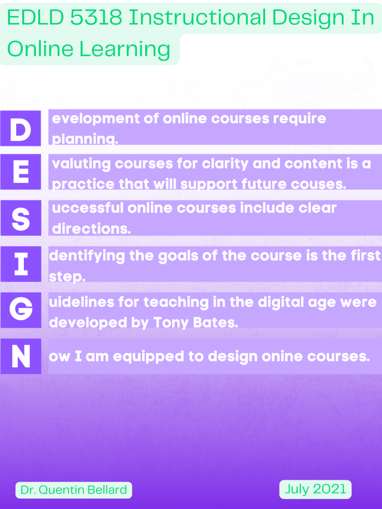 The coursework EDLD 5318 Instructional Design In Online Learning was timely and practical for me. It fit right in with the 3D printer initiative for the elementary libraries. It was essential to have a way to prepare campus staff to implement the 3D printers effectively. An online course in our learning management system was the perfect forum for that. After reading Tony Batesโ Teaching in a Digital Age, and developing a plan using an Understanding by Design Template and Finkโs 3 Column Table the outline learning outcomes, I was equipped to design a solid online course. A process that proved to be very valuable was the OSCQR Course Design Review to evaluate elements of the online course. Overall, I used the strategies gained in EDLD 5318 to share resources and design an online community to support the new learning. This was a strong beginning to make the 3D printer initiative a success. All elementary librarians, campus techs and some curriculum specialists and teachers were enrolled in the course to build their skills. Participation in this course was in progress when I left Killeen ISD to work in Copperas Cove ISD.