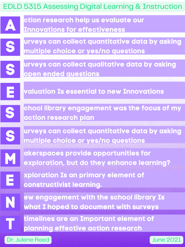 In EDLD 5315 Assessing Digital Learning & Instruction we read Mertlerโs online book Action Research and planned methods of quantitatively and qualitatively measuring the instructional impact of the implementation of our innovation plan. The focus of my action research plan was the 3D printer initiative for our elementary libraries. My fundamental research question was, “To what extent does equipping elementary libraries with 3D printers impact student engagement in the library?โ Prior to completing our action research plans, we created an outline and wrote a third literature review. Since I moved to a neighboring school district with a promotion to Director of Digital Learning and Innovation in January 2022, I was not able to fully carry out this action research. However, developing the process and considering methods of evaluation is very important to future innovations in my new school district.