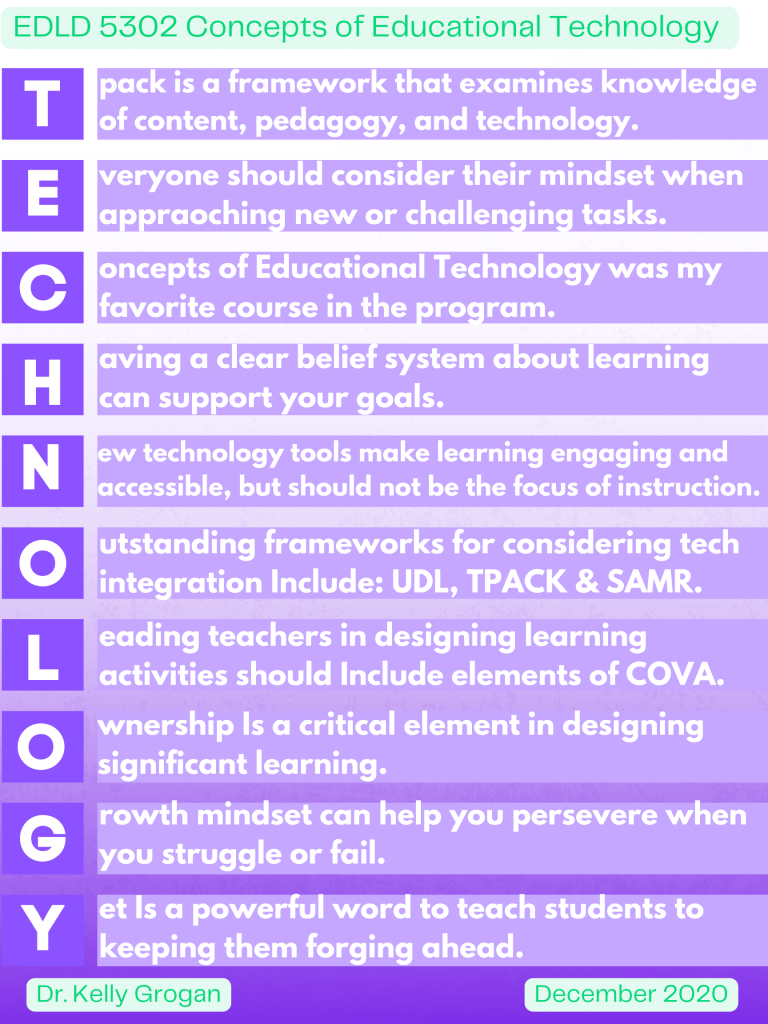 EDLD 5302 Concepts of Educational Technology was probably my favorite course in the entire program! I loved exploring the introspective topic of Growth Mindset based on the work of Carol Dweck and the opportunity to create a learning manifesto. We explored the SAMR, UDL and TPACK frameworks which are essentials for digital leaders to consider when planning professional learning, designing instruction, or recommending online and software applications. These frameworks should be communicated to teachers and staff to help them use technology in more effective ways. In 5302, I also designed a list of Professional Learning Networks that I have continued to add to and share with colleagues.