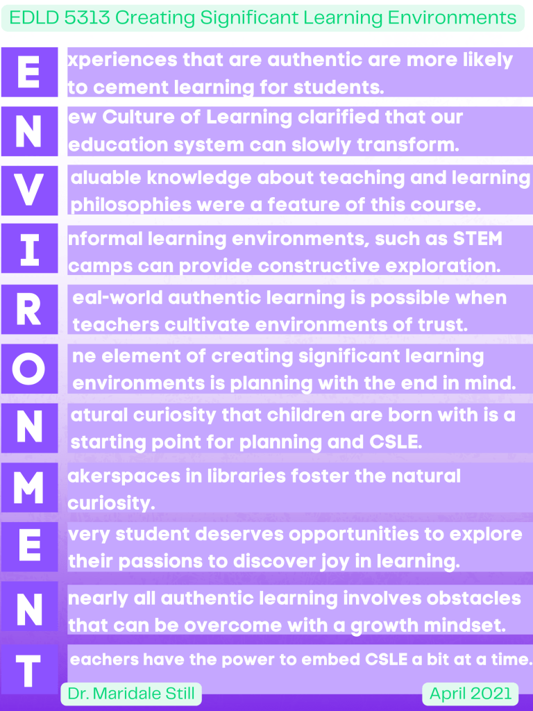 In EDLD 5313, Creating Significant Learning Environments, I appreciated the opportunity to refresh my memory on the various learning philosophies like constructivism. The first time around that I learned those things in college I did not have a good grasp of the theories. I was inexperienced. Also when I was in college and learning those theories, I was not yet a parent. The concepts felt somewhat abstract to me. As you watch students and your personal children learn and grow, those learning philosophies take on new meaning. In this course, after reading The New Culture of Learning, we asked What If questions around the possibilities of creating connections and positive culture to support learning. I organized these ideas in a Sway presentation and created a metaphorical video relating a classroom to a farm.