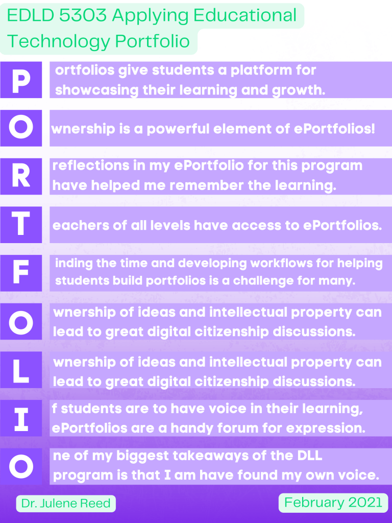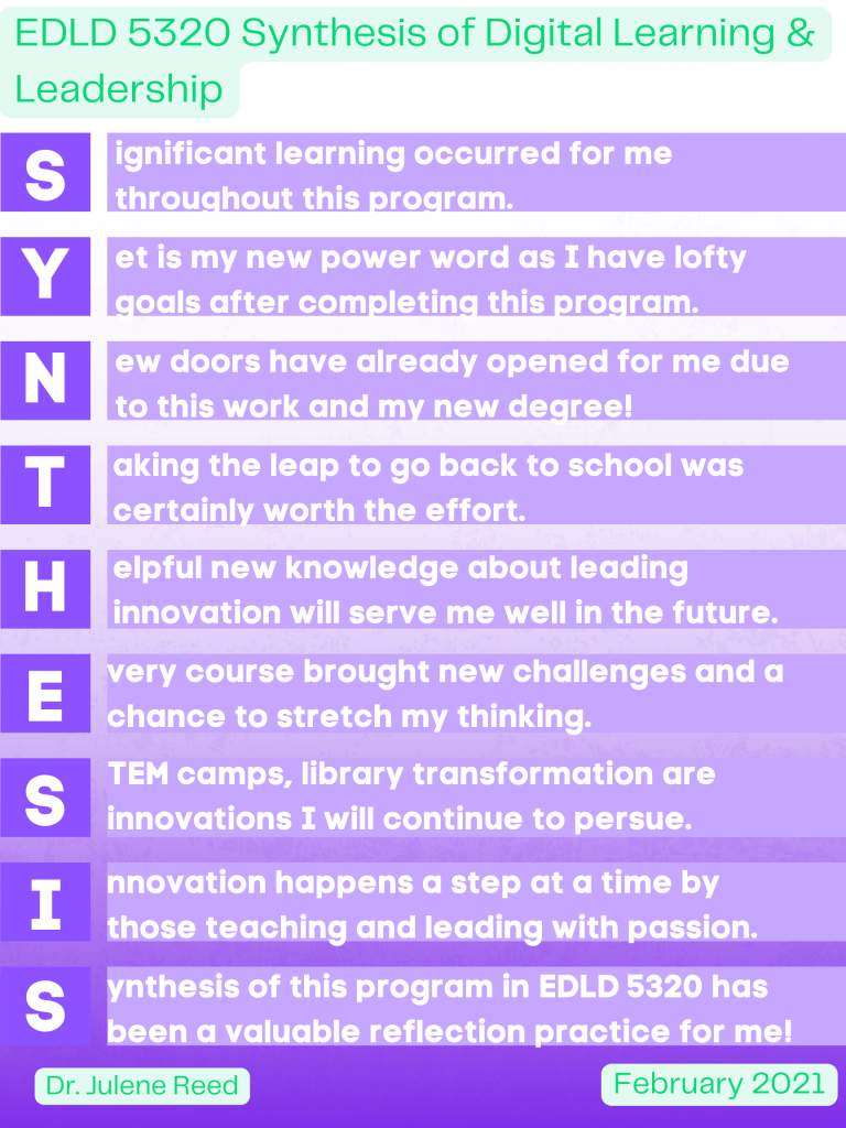 EDLD 5320 Synthesis of Digital Learning & Leadership has been an incredible opportunity to revisit the learning and work we have completed on our Digital Learning and Leading Journey. I am grateful to have it all my ePortfolio to refer to. That is true ownership.