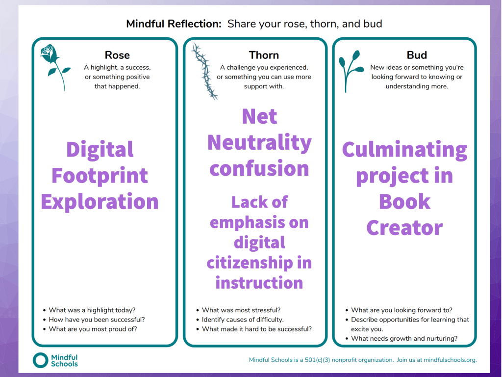 Mindful Schools outlines a fun and effective reflection activity called Rose, Thorn and Bud as a way of attaching thoughts and feelings to learning experiences. I will frame this reflection with that method.